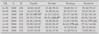 I conducted a comprehensive grid search across four DQN variants (Vanilla, Double, Dueling, Rainbow) and three key hyperparameters: Learning Rate (LR), Target Update Frequency ($C$), and Hidden Dimension ($H$). All agents were trained for 5 million steps. Table 1 summarizes the average score over the last 10% of training steps, revealing several critical insights regarding training stability and performance.