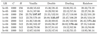 Moreover, increasing the network capacity from $256$ to $512$ did not guarantee improvement. Surprisingly, Vanilla DQN achieved its highest score ($197.07$) with the lighter network ($H=256$), suggesting that for the standard architecture, a larger model might introduce overfitting or optimization difficulties given the limited data diversity of a single game. However, Rainbow generally preferred the larger capacity ($H=512$), utilizing the extra parameters effectively to combine the benefits of Double and Dueling mechanisms.