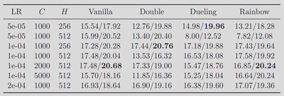 $$Q(s, a; \theta, \alpha, \beta) = V(s; \theta, \beta) + \left( A(s, a; \theta, \alpha) - \frac{1}{|\mathcal{A}|} \sum_{a'} A(s, a'; \theta, \alpha) \right)$$Rainbow