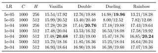 Pong) did not universally transfer to others (e.g.,Breakout) without adjustment. While “default” settings provided a strong starting point, achieving state-of-the-art performance required task-specific tuning of the exploration-exploitation balance.