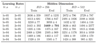 Hyperparameter Grid Search Results on Hopper-v4. Train and Eval performance are reported side-by-side (Mean $\pm$ Std over two seeds). The best evaluation performance is highlighted in bold.