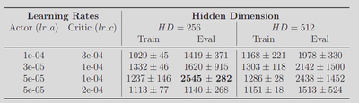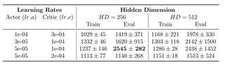 High Capacity Potential (Green Curve): The Green line ($HD=512, lr\_a=5\text{e-}5, lr\_c=5\text{e-}4$) achieves the highest asymptotic performance in this run, consistently staying above $3300$. While the grid search table (5{reference-type=“ref+label” reference=“tab:grid_search_hopper”}) indicated that $HD=512$ has higher variance on average, this specific trajectory shows that when it succeeds, the larger capacity allows for a more fine-grained control strategy that sustains higher speeds than the smaller network.