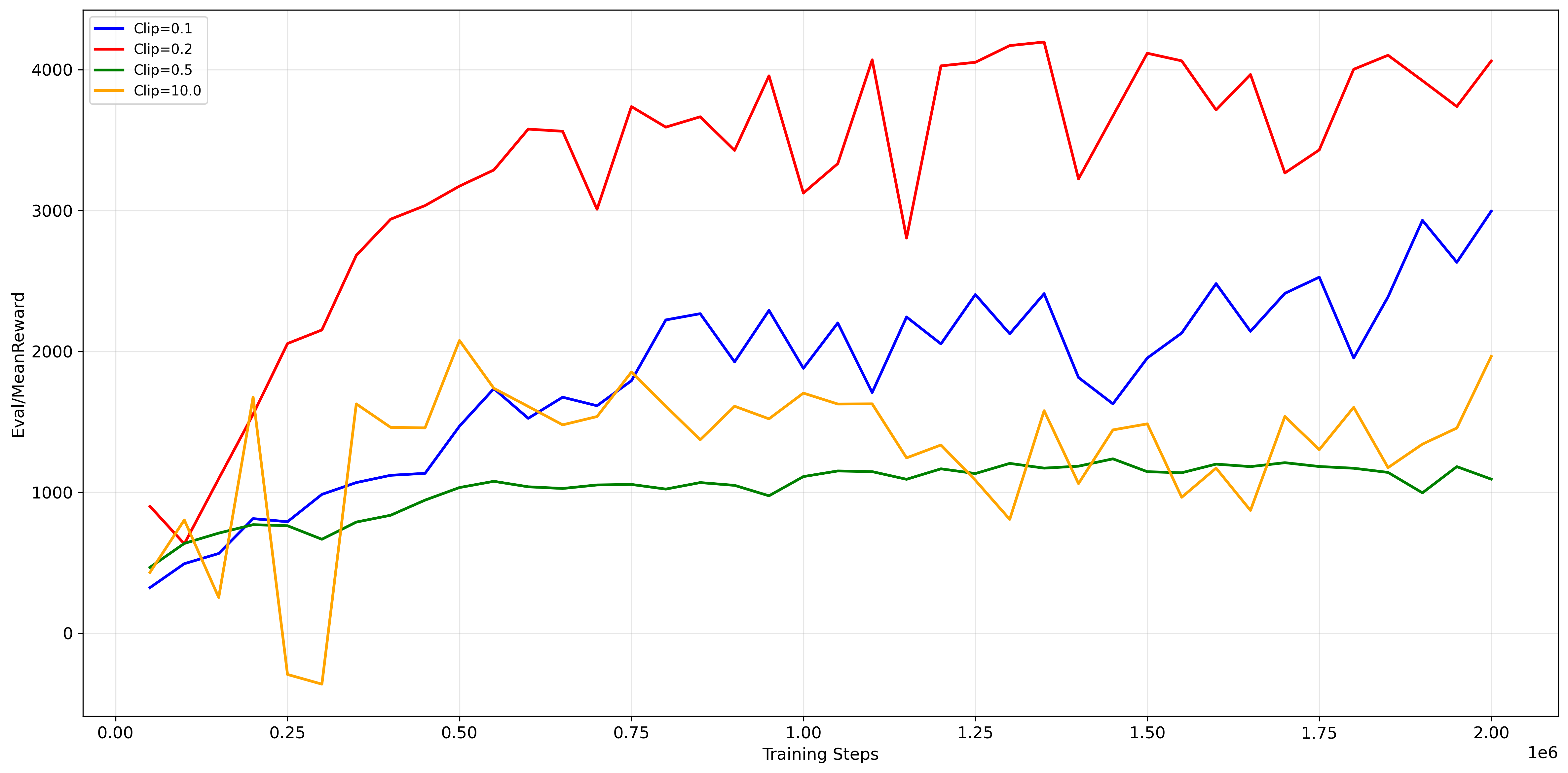 Hopper, where the agent falls quickly,Antcan survive in a “non-walking” state, leading to a long plateau of low-quality local optima.Phase Transition and Ascent (3M - 4.5M steps): Around 3M steps, the agent discovers a stable walking pattern, triggering a phase of exponential policy improvement. The evaluation reward climbs vertically, breaking the 3500 mark at around 4.5M steps. This indicates that once the basic coordination primitive is found, PPO can rapidly optimize the gait for speed.