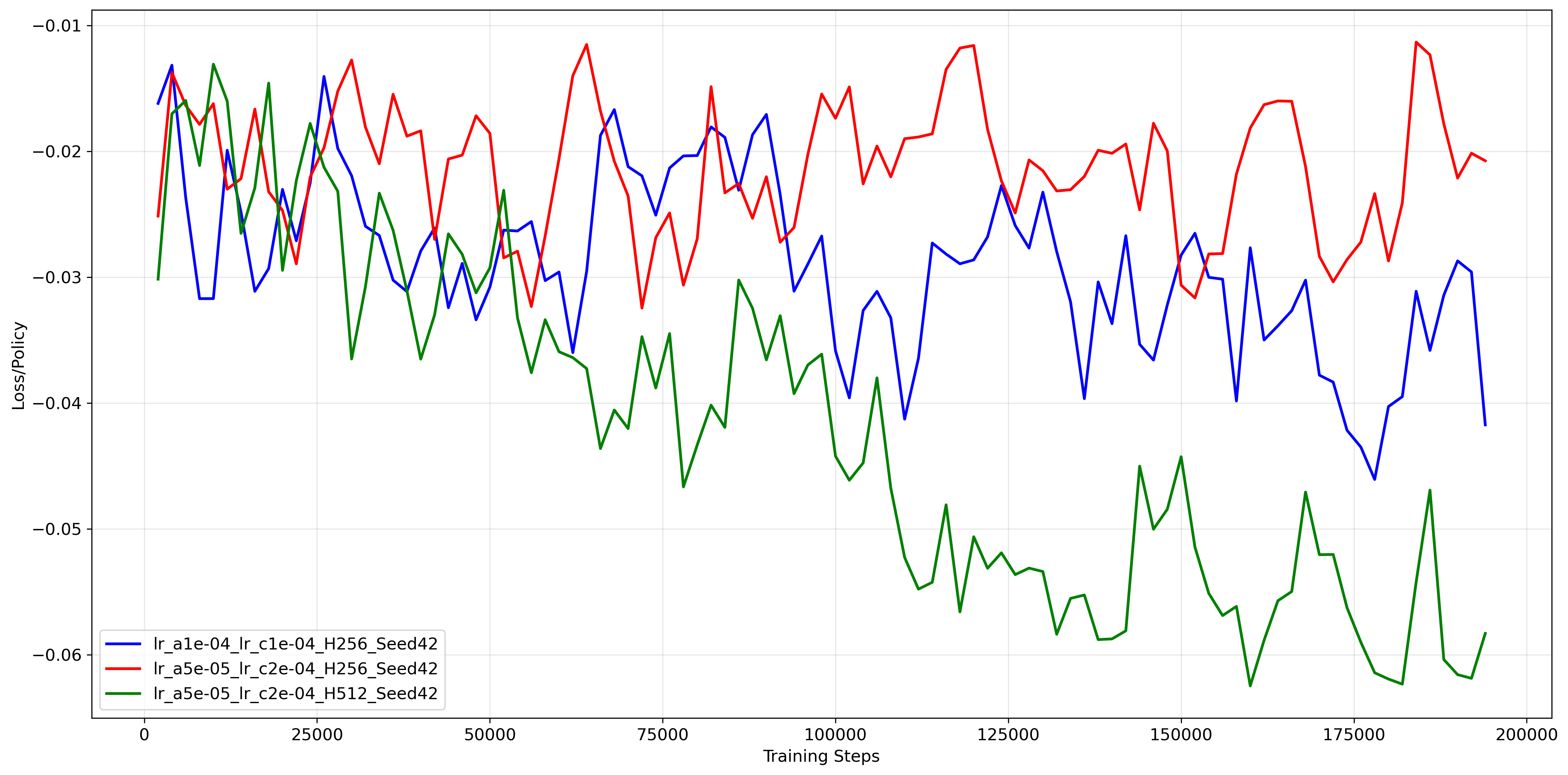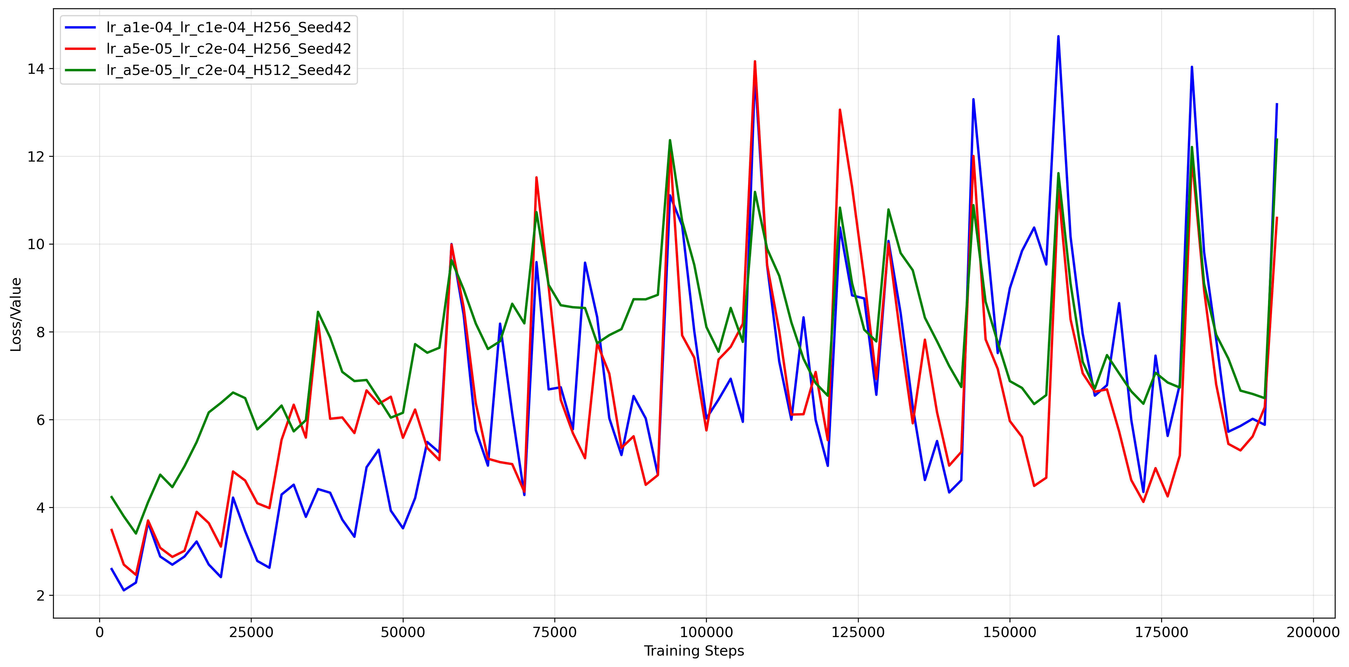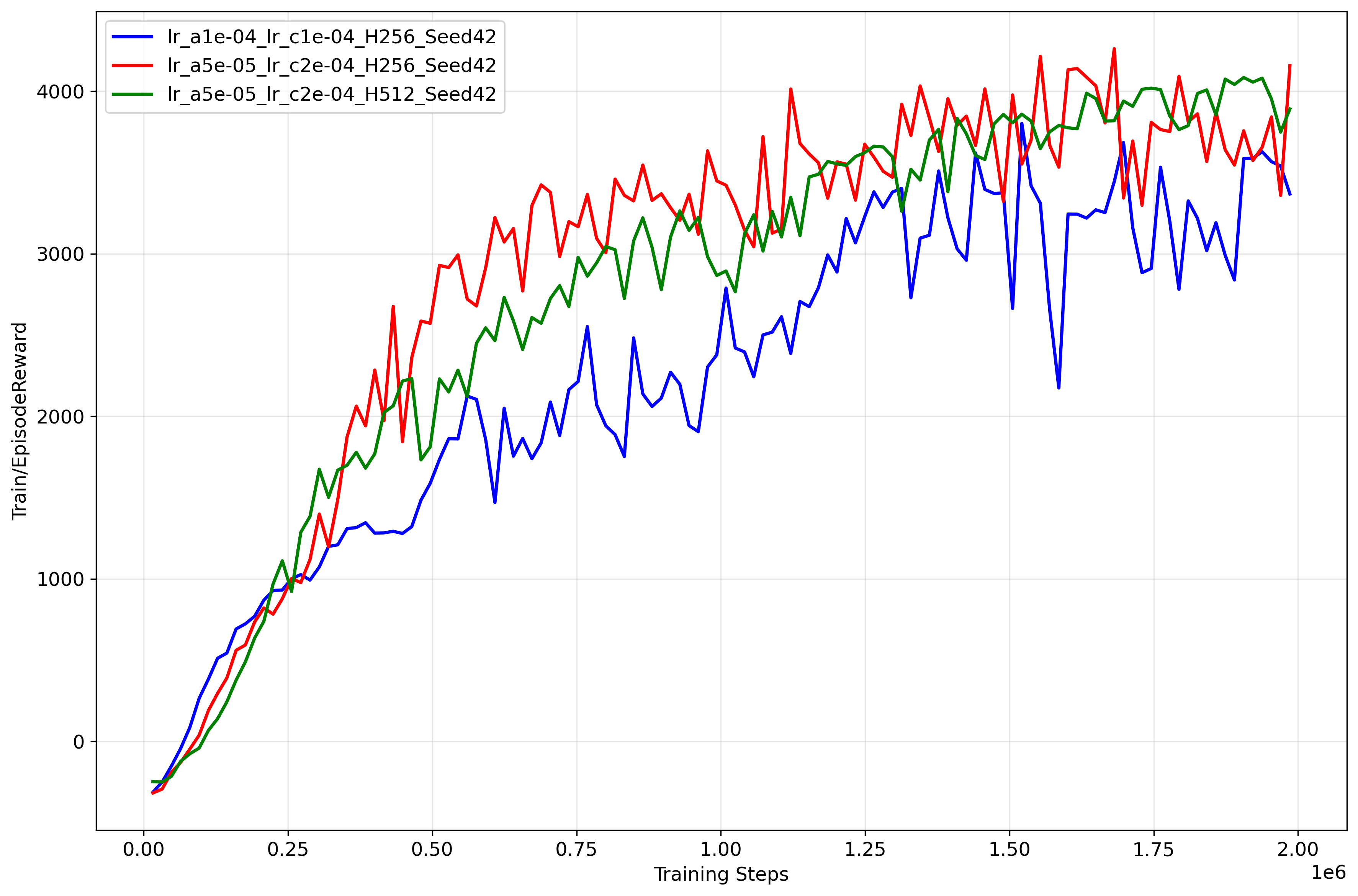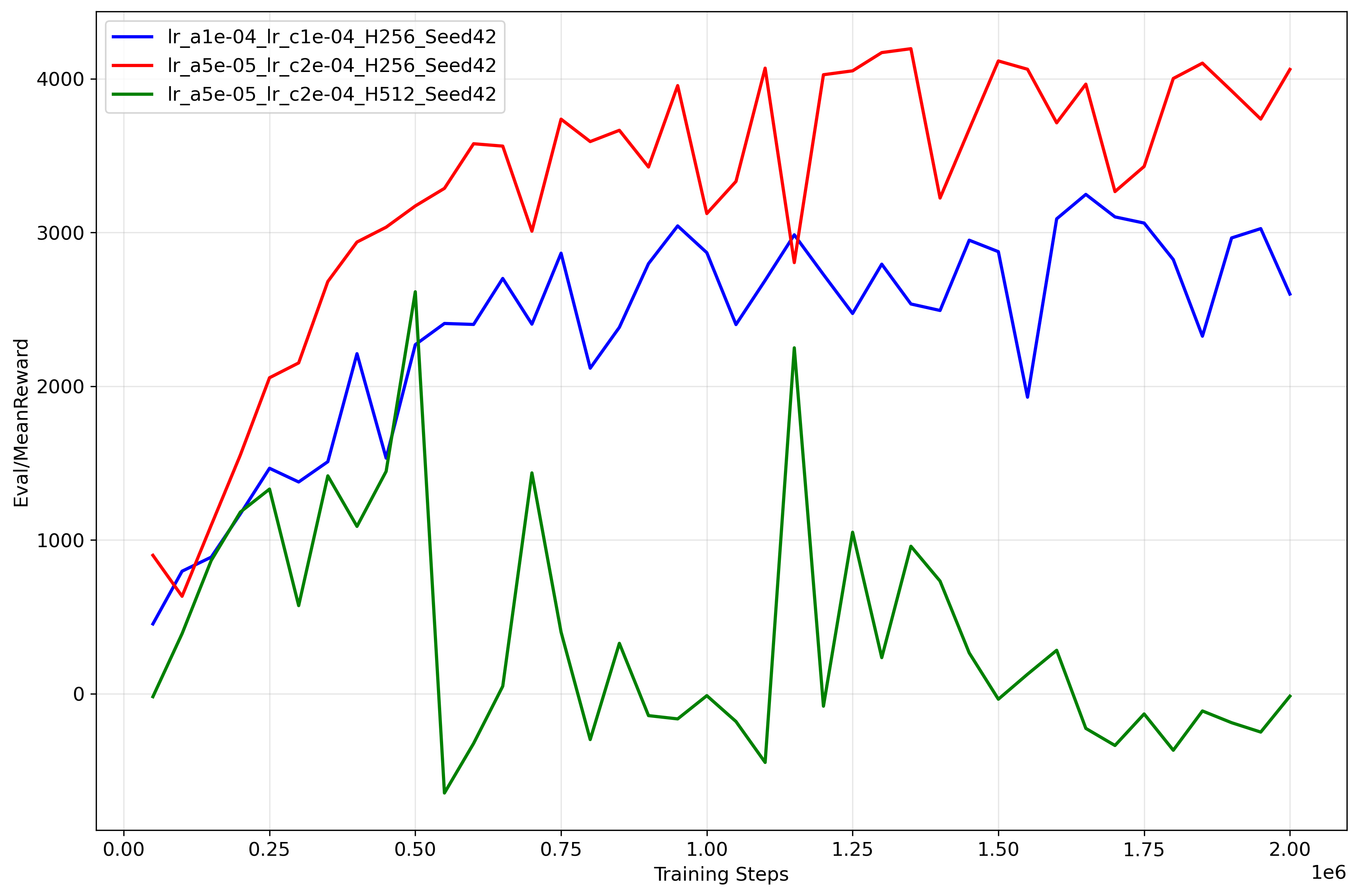 High Capacity Potential (Green Curve): The Green line ($HD=512, lr\_a=5\text{e-}5, lr\_c=5\text{e-}4$) achieves the highest asymptotic performance in this run, consistently staying above $3300$. While the grid search table (5{reference-type=“ref+label” reference=“tab:grid_search_hopper”}) indicated that $HD=512$ has higher variance on average, this specific trajectory shows that when it succeeds, the larger capacity allows for a more fine-grained control strategy that sustains higher speeds than the smaller network.