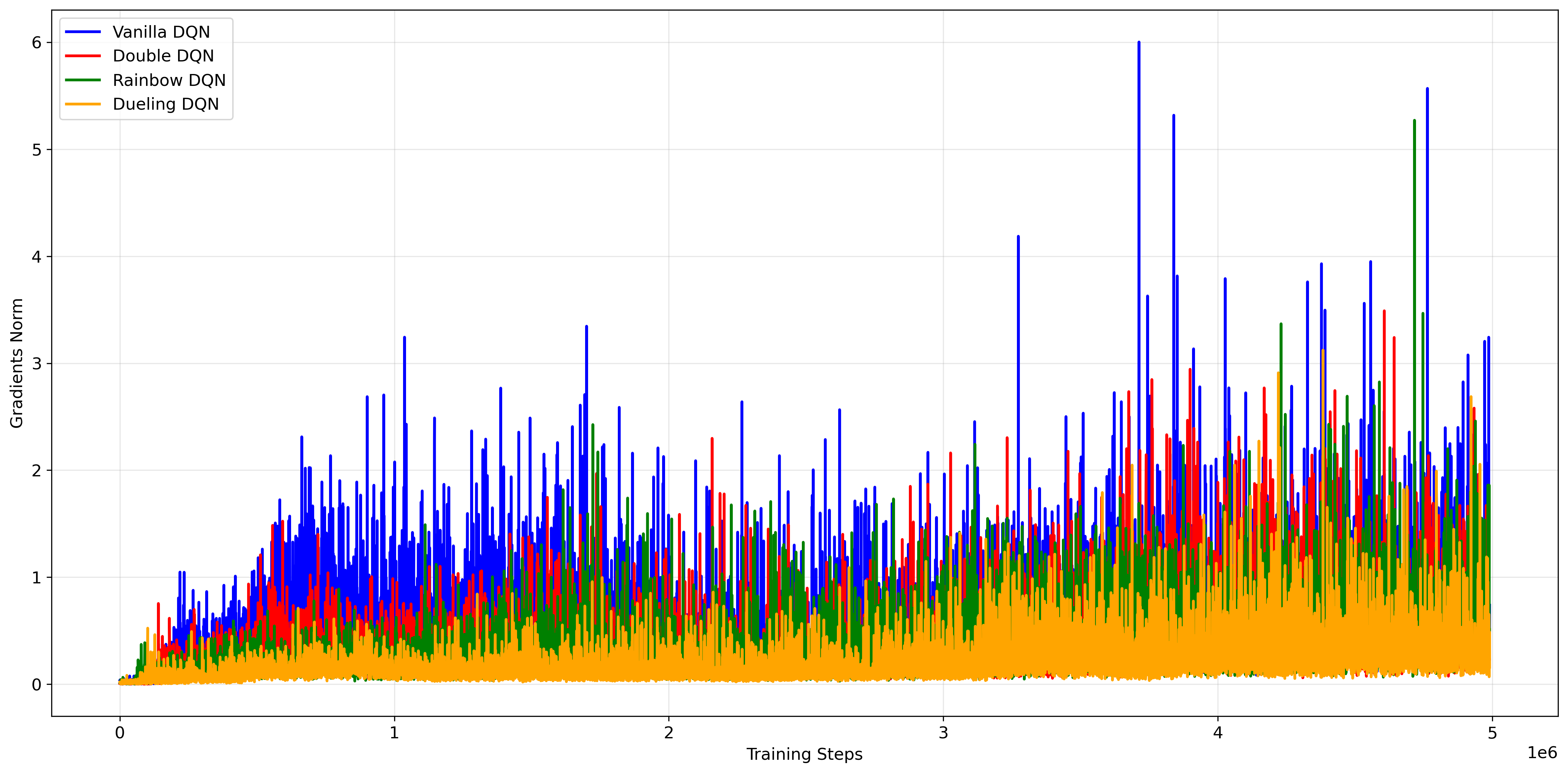 In the Atari domain, experimental results challenged the assumption that “bigger is better." While Rainbow DQN consistently outperformed baselines by combining multiple enhancements, the Vanilla DQN achieved surprisingly competitive scores on Breakout ($197.07$) using a smaller network capacity ($H=256$). Conversely, larger networks ($H=512$) often led to instability in simpler architectures, highlighting a risk of overfitting. The Dueling architecture proved to be the most critical structural improvement, significantly smoothing the optimization landscape (reducing gradient variance by $\sim 75\%$) by decoupling state-value estimation from action advantages.