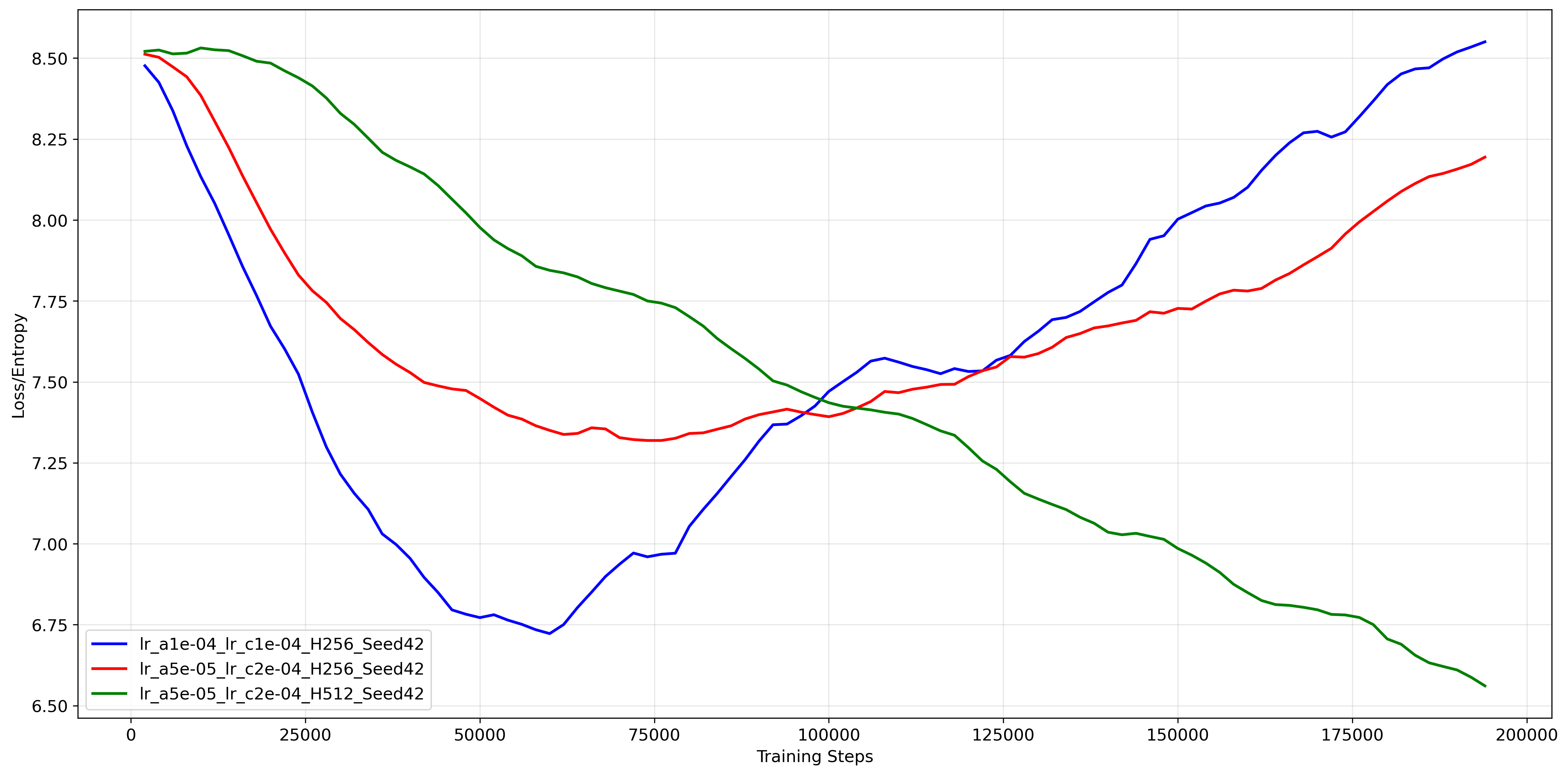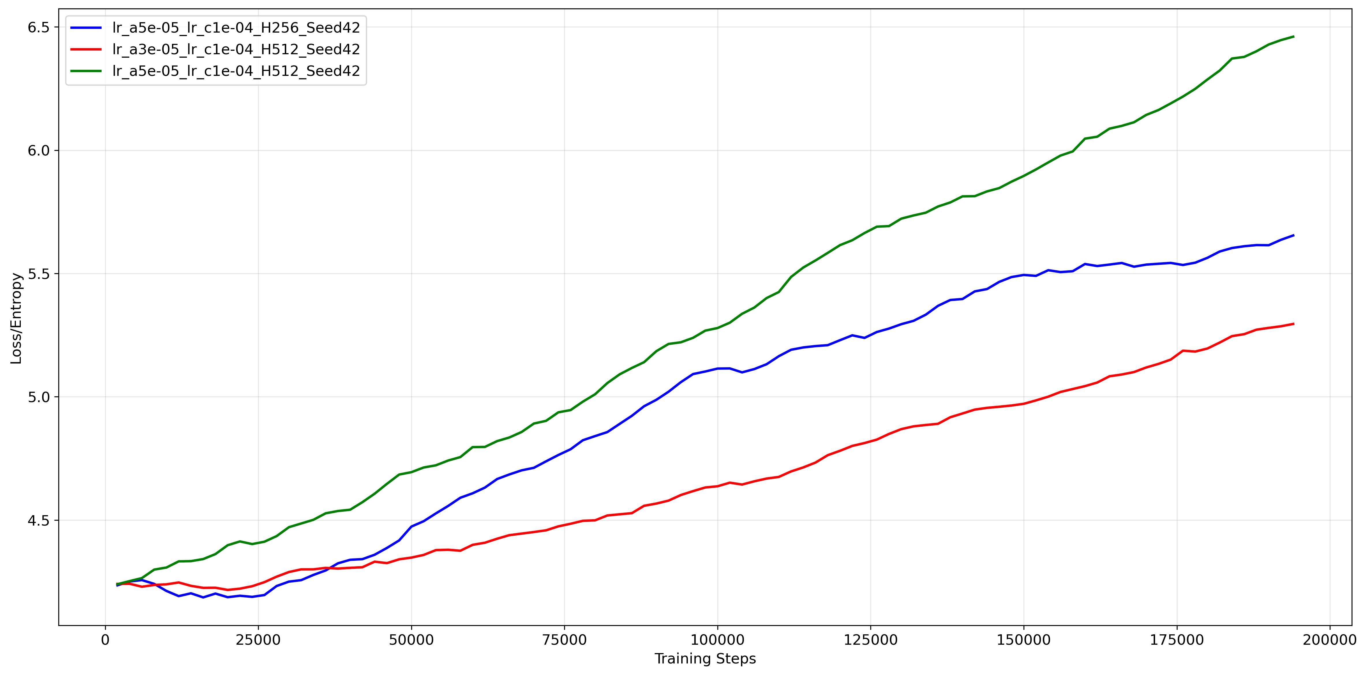 Hopperrequires a high degree of stochasticity or that the agent is “widening” its action distribution to maintain robustness against perturbations. UnlikeHalfCheetahwhere the agent converges to a specific gait, theHopperagent might benefit from a broader action variance to react to potential falls.Scale: The absolute entropy values ($4.0 - 6.5$) are lower than in