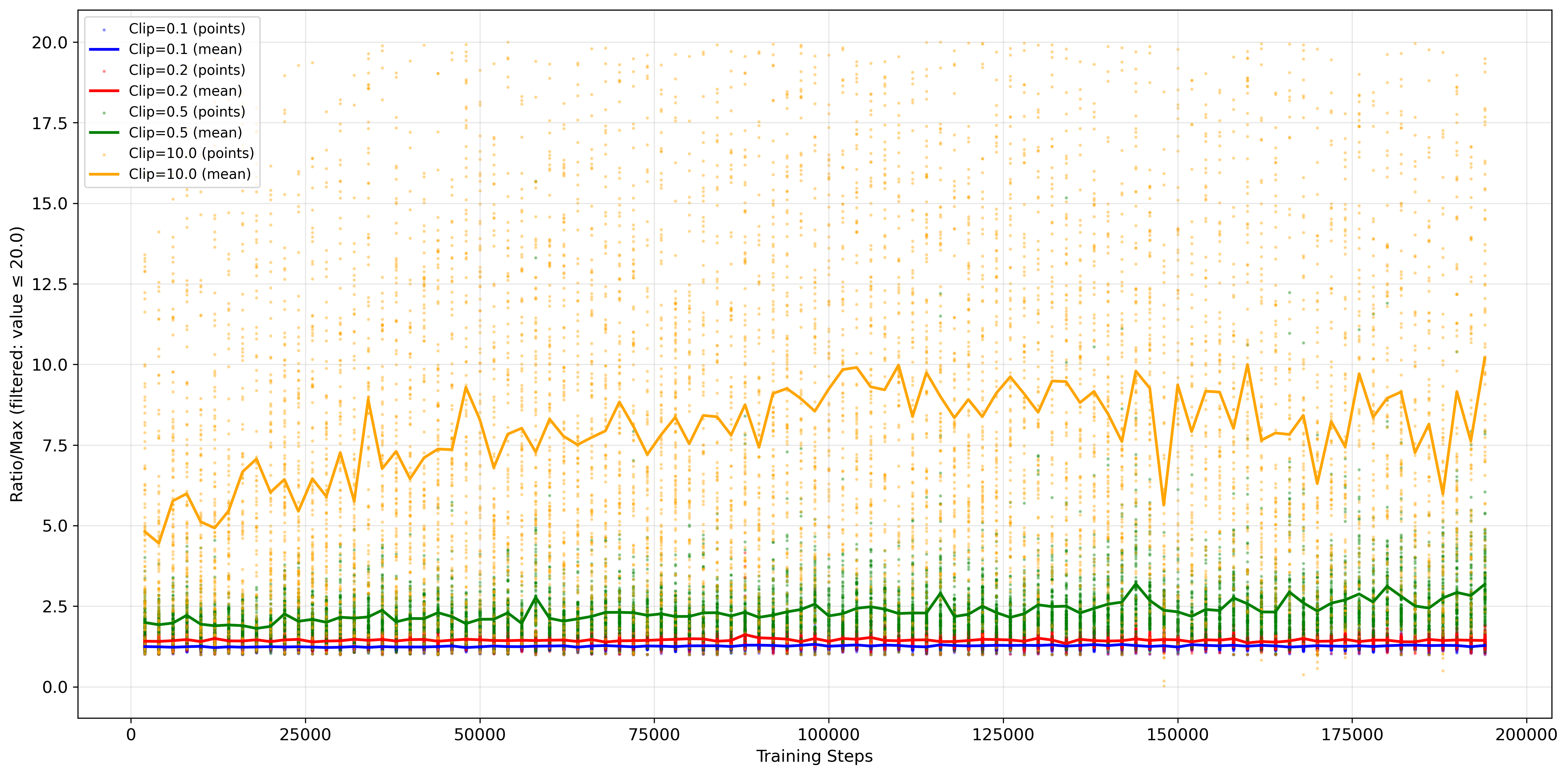 Moreover, I analyzed the stability of the policy updates by examining the maximum Probability Ratio $r_t(\theta)$ recorded during training, as shown in 32{reference-type=“ref+label” reference=“fig:hopper_ratio”}.