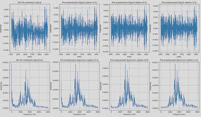 $$ y[n] = x[n] - \alpha x[n-1] $$where $x[n]$ is the input signal, $y[n]$ is the output, and $\alpha$ (typically 0.95β0.97) controls emphasis strength.