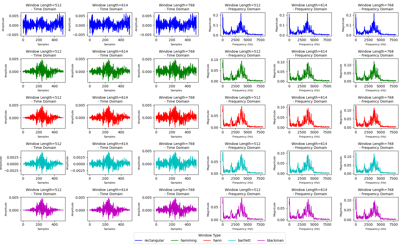 $$ x_i^{\text{windowed}}[n] = x_i[n] \cdot w[n], \quad 0 \leq n < L $$Window Type Comparison: