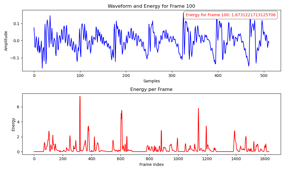 $$ E = \sum_{i=0}^{L-1} s_i^2 $$where $s_i$ is the $i$-th sample in the frame, and $L$ is the frame length.