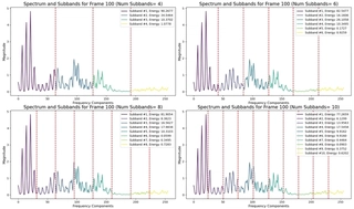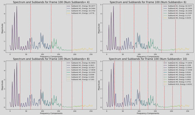 $$ E_m = \sum_{k \in B_m} |S(k)|^2, \quad m = 1, 2, \ldots, 6 $$where $B_m$ is the set of frequency bins in the $m$-th sub-band.