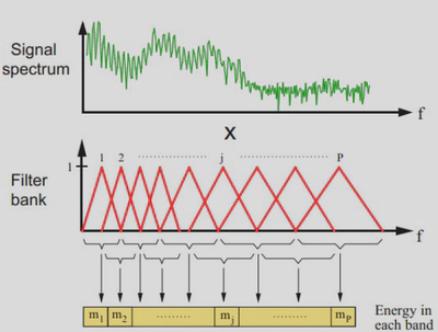 $$ \text{mel}(f) = 2595 \log_{10}\left(1 + \frac{f}{700}\right) $$Mel-scale filter bank energies