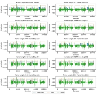 Models were tested with frame lengths (320β4096) and shifts (80β2048). DNN outperformed others (frame length 4096, shift 1024):